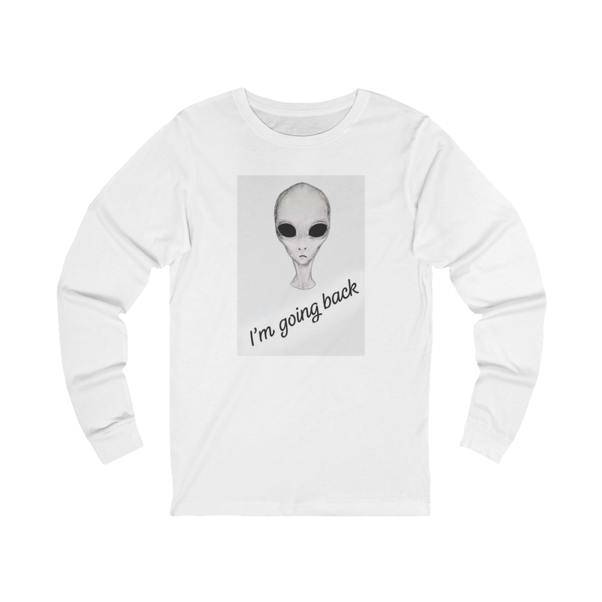 A lightweight long-sleeve tee with a playful, slightly eerie vibe: a soft white retail-fit shirt printed with a minimalist alien face and the handwritten line “I’m going back.” It feels like a quiet nod to late-night stargazing, roadside diner conversations, and inside jokes among UFO fans. Wear it when you want something low-key but expressive — the image sits front-and-center, balanced by clean lines and a comfortable cut. The fabric drapes softly, sleeves reach the wrist, and the ribbed collar keeps its shape after many wears. This shirt reads like a small story someone would tell over coffee: curious, a little wistful, and quietly rebellious.