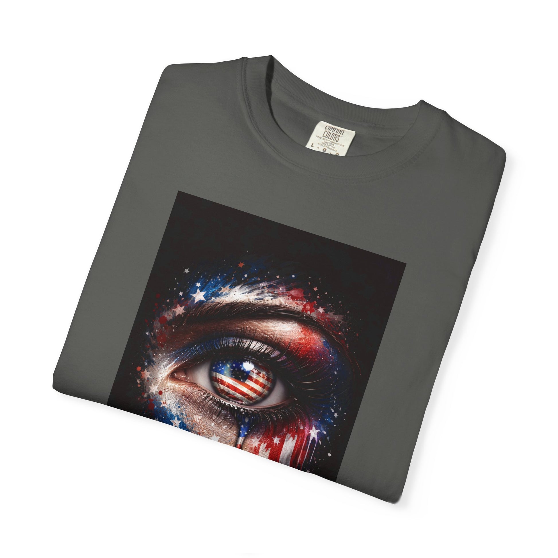This heavyweight garment-dyed tee carries a bold, atmospheric print—an eye rendered in cosmic blues and bleeding reds, like a memory caught between starlight and paint. The soft, worn-in color and substantial weight give it a lived-in comfort that matches the artwork’s raw, emotional edge. Wear it when you want your style to feel thoughtful and slightly defiant: layered under a denim jacket for dusk walks, or alone when you need a quiet reminder that vulnerability can be striking. The relaxed fit and durable construction mean it moves with you and keeps showing its character wash after wash.